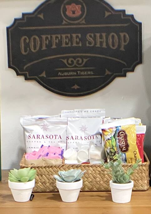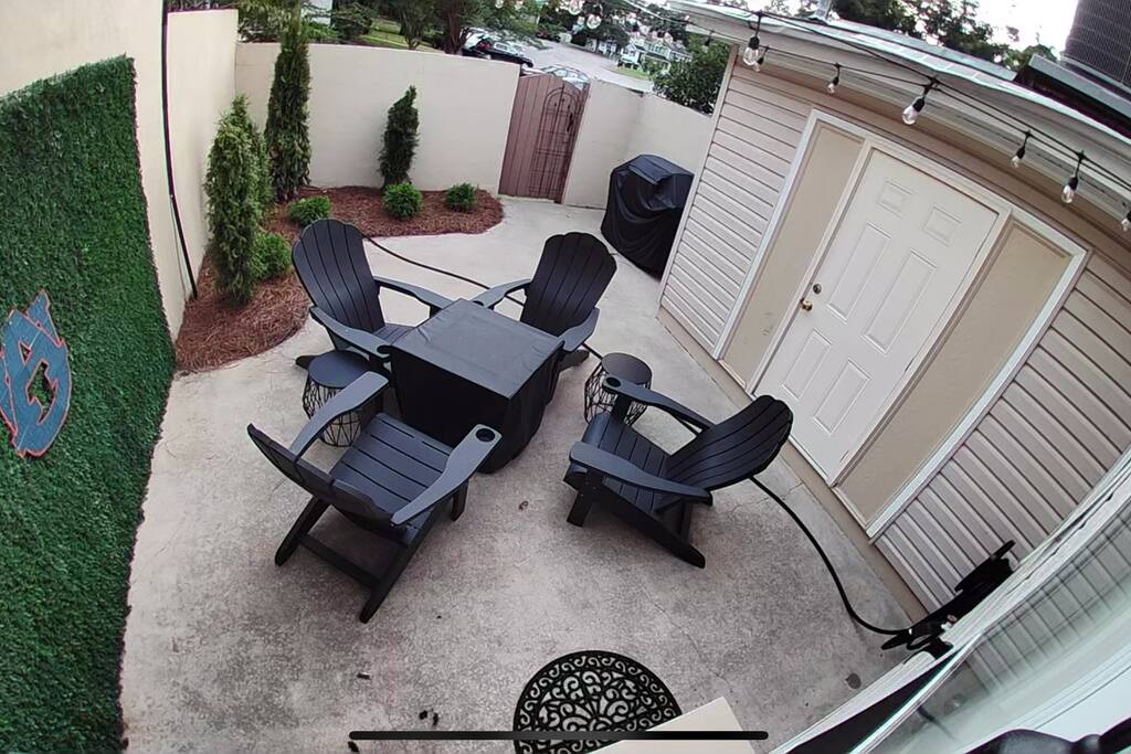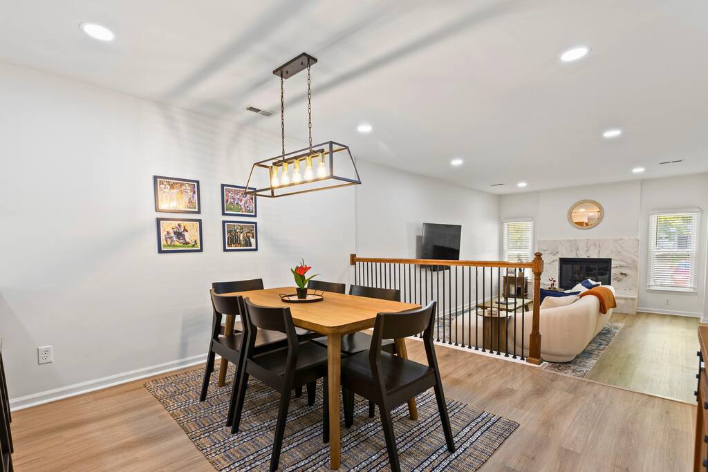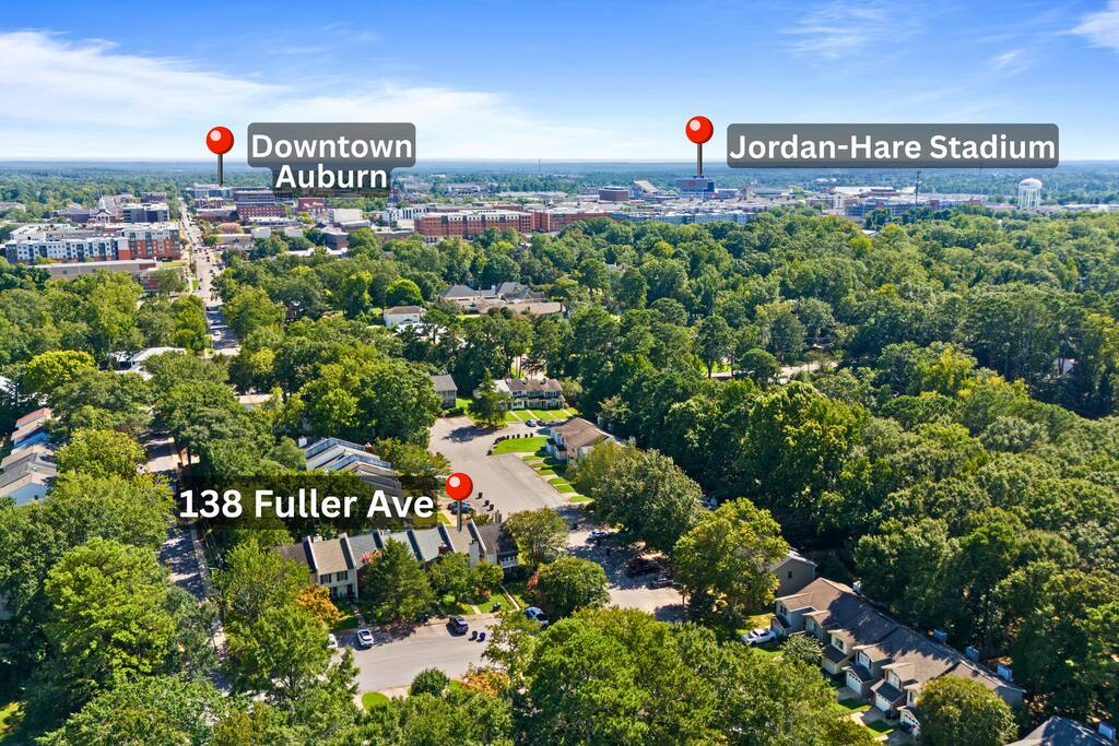 Bedroom 1 - King Bed Bedroom 2 - 2 Queen Beds 2 full baths are upstairs. 1/2 bath plus laundry room are downstairs. FREE PARKING for 2 cars. Designated parking spots in front of the townhouse. EATING AREA for 9– 6 top dining table plus 3 counterstools at kitchen bar. MODERN LIVING AREA Stylish sectionsl sofa facing updated fireplace and tv. Stocked coffee bar. PRIVATE BACKYARD WITH LARGE PATIO Grill, adirondack chairs and fire pit with outdoor string lights create a perfect spot to unwind after a game. NEED MORE SPACE - Check out our sister property in the same neighborhood. Aubie's Abode- 3 bedroom - sleeps 7
