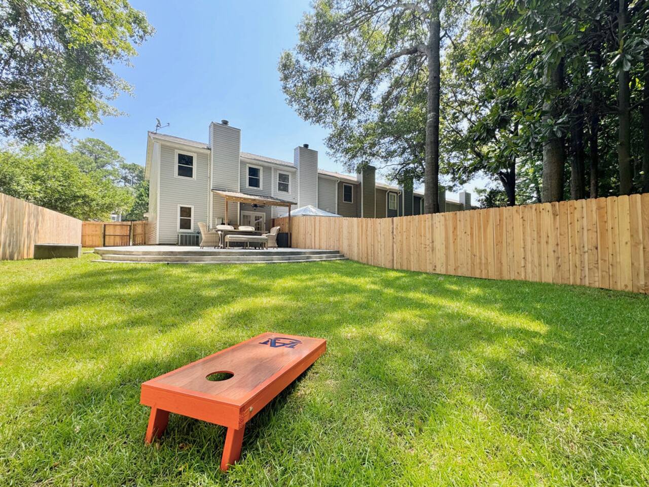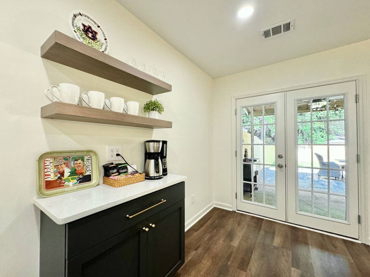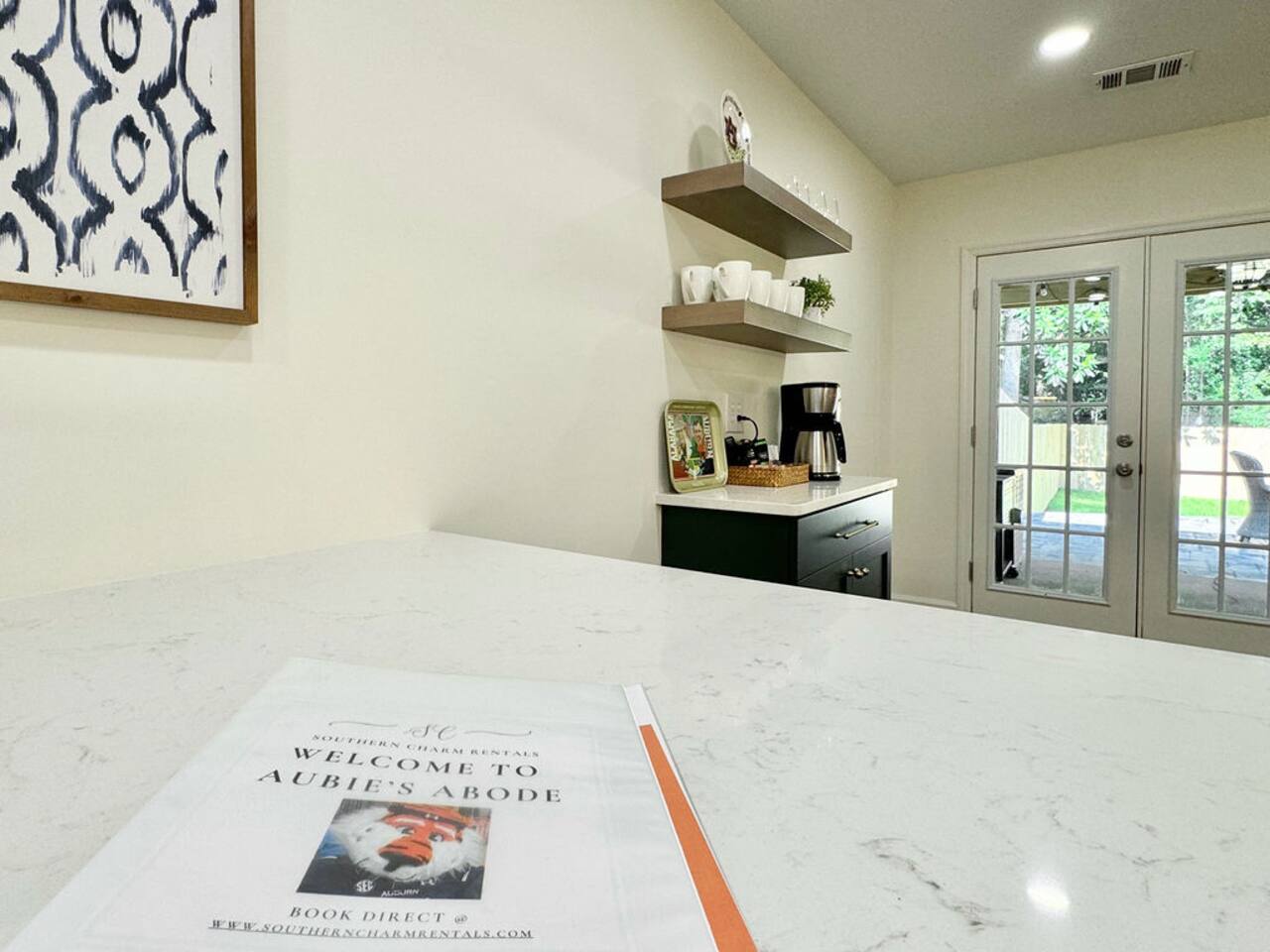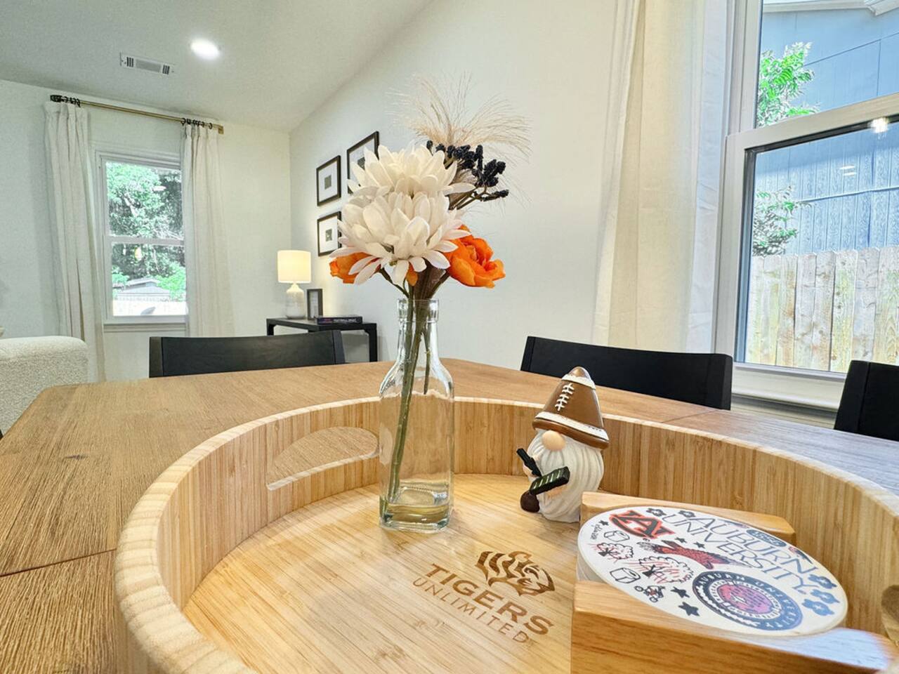 THE SPACE Comfortably sleeps 7 to 9 — Bedroom 1 - King Bed Bedroom 2 - King Bed Bedroom 3 - Queen/Twin Bunk Bed Additional Queen size air mattress available upon request. 2 full baths are upstairs. 1/2 bath plus laundry room are downstairs. FREE PARKING for 3-4 cars. An extended private driveway is in front. EATING AREA for 9– 6 top dining table plus 3 counterstools at kitchen bar. MODERN LIVING AREA Stylish curved sofa facing updated fireplace and tv. Stocked coffee bar. Extendable dining table FENCED BACKYARD WITH LARGE PATIO New Weber grill, outdoor dining table with built-in fire pit, large cooler on wheels. Corn hole and Jenga too! IF AUBIE'S ABODE IS ALREADY BOOKED FOR YOUR DATES - check out our sister property that is in the same neighborhood just a few doors down. Aubie's Hangout - 2 bedrooms - sleeps 6
